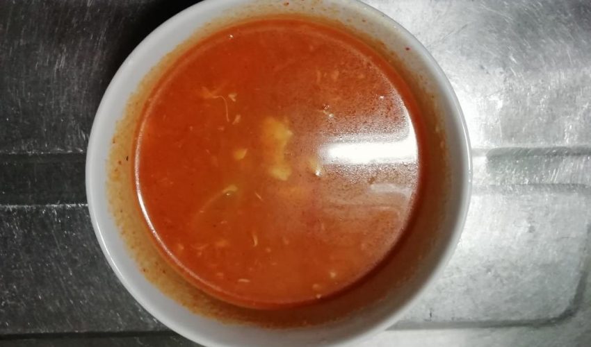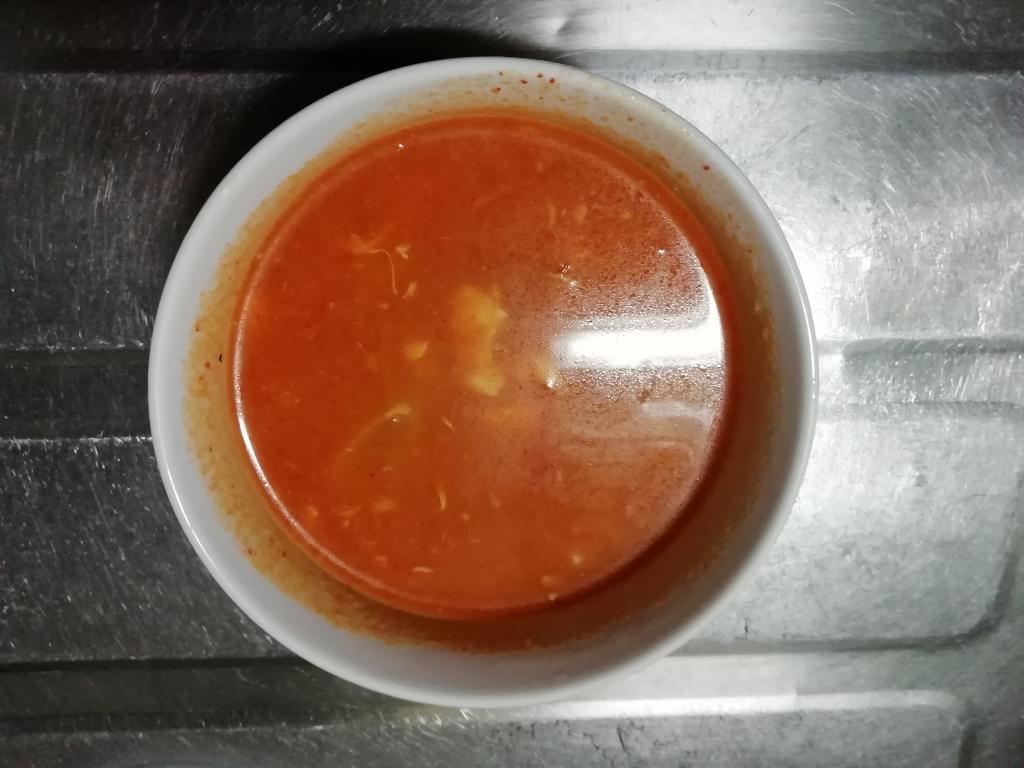 ・ブデチゲ(業務用スーパーで100円くらいのスープの素に、豆腐とねぎと卵を入れいました。写真は食べ終わった残りです。笑 明日におじやにでもします)
