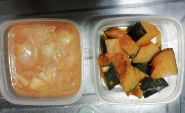 共働き子育て夫婦 本日の食卓・カレー(鶏肉、にんじん、じゃがいも、たまねぎ)・おから(昨日の残り)・お吸い物(粉末)・豚キム…