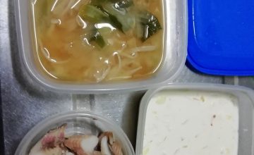 共働き子育て夫婦 本日の食卓・豆腐とニラと卵と天かすの煮込み(昨日の残り)・ししゃも(昨日の残り)・油揚げと玉ねぎの味噌汁(昨日の残…